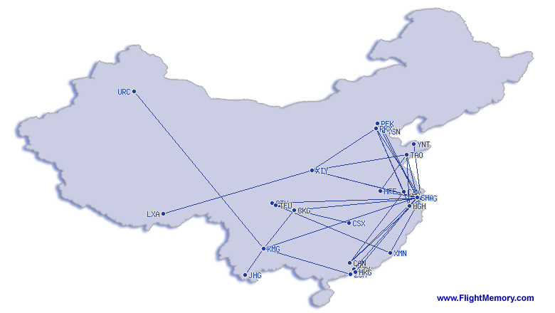 | kürzester Flug: | 44 km, 6:30 h, Shanghai (Pudong) - Shanghai (Hongqiao), 10.10.2025 |