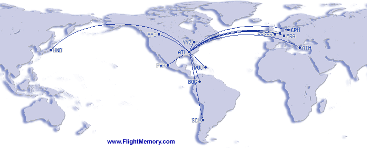 | Наиболее короткий полет: | 171 km, 0:41 h, Atlanta (Hartsfield - Jackson Int.) - Chattanooga (Lovell Field), 20.10.2025 |