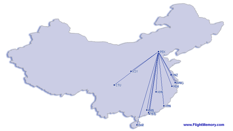 | kürzester Flug: | 806 km, 1:25 h, Beijing (Capital) - Yancheng (Nanyang), 30.11.2025 |