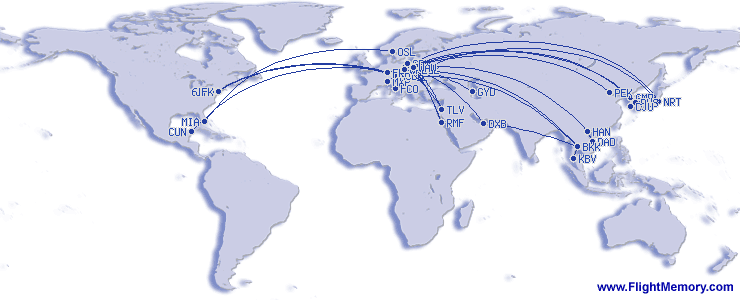 | najdaljši let (časovno): | 12:50 h, 9,915 km, Tokyo (Narita) - Roma (Leonardo da Vinci/Fiumicino), 14.11.2012 |