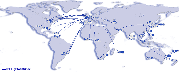 Penerbangan Paling Lama:11:29 h, 9.377 km, Port Louis (Sir Seewoosagur Ramgoolam) - Frankfurt (Rhein-Main), 02.03.2026