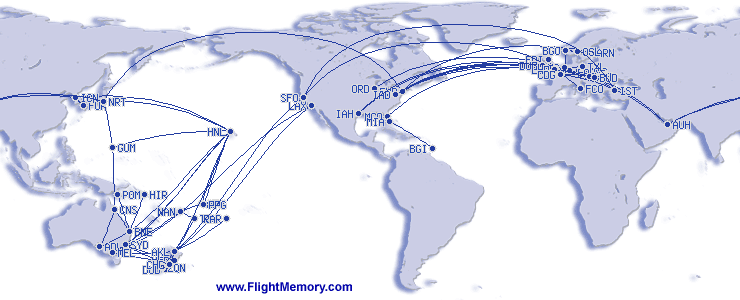 Penerbangan terjauh: | 7,936 mi, 14:41 h, Los Angeles (International) - Melbourne (Tullamarine), 11-02-2002 |