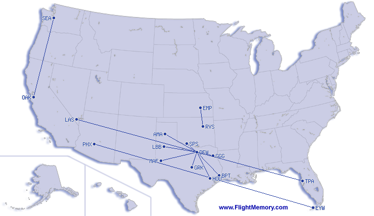 | kürzester Flug: | 182 km, 0:23 h, Wichita Falls (Sheppard) - Dallas/Fort Worth (International), 01.11.2025 |