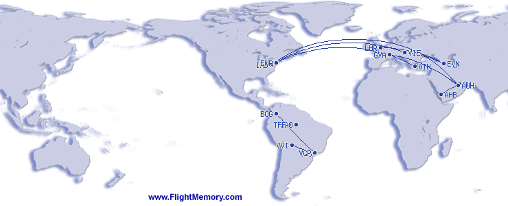 | Vuelo más largo (Distancia): | 11,399 km, 12:25 h, Washington (Dulles) - Abu Dhabi (International), 22.11.2025 |