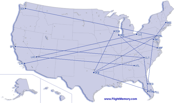 | Μεγαλύτερη πτήση (Διάρκεια): | 5:56 h, 2,399 mi, Philadelphia (International) - Los Angeles (International), 04-15-2026 |