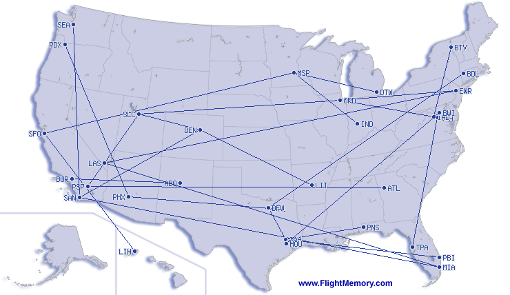 | Najduzi let (trajanje-vremenski): | 6:01 h, 2,225 mi, Newark (Liberty) - Las Vegas (Harry Reid International), 03-09-2026 |