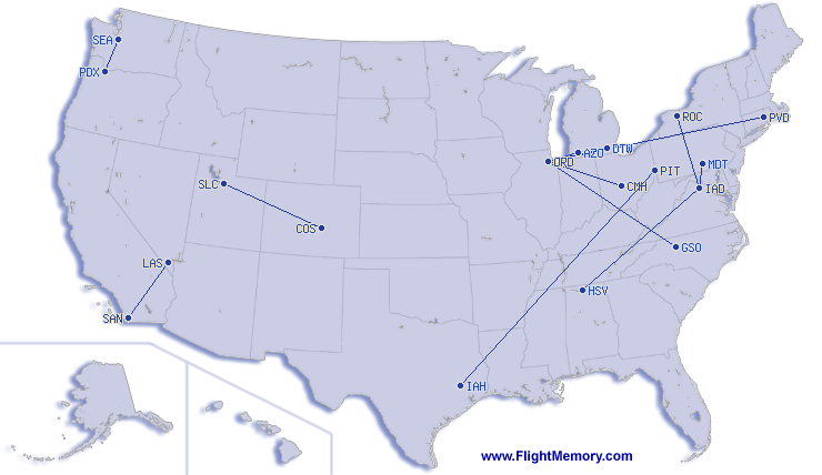 | Najkraci let: | 94 mi, 0:40 h, Washington (Dulles) - Harrisburg (International), 03-25-2026 |