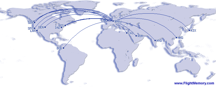 | Penerbangan terlama: | 14:20 h, 5,747 mi, Osaka (Kansai International) - München (Franz Josef Strauß), 04-26-2026 |