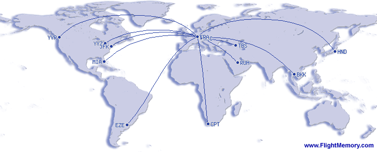 | 最大距離を持つフライト: | 7,154 mi, 13:15 h, Buenos Aires (Ezeiza - Ministro Pistarini) - Frankfurt (Rhein-Main), 01-20-2026 |