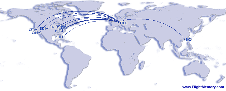 најдолг лет (оддаличеност): | 6,017 mi, 11:40 h, Munich (Franz Josef Strauss) - San Diego (Lindbergh Field), 10-17-2025 |