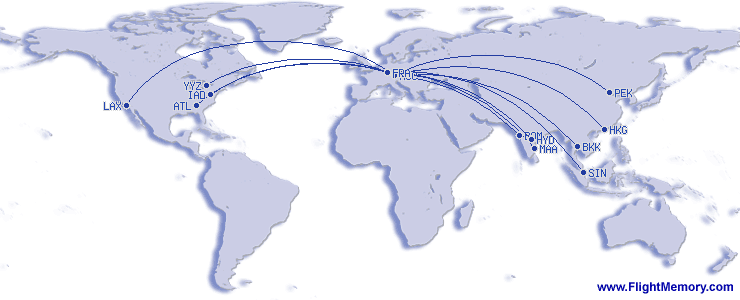 | najdaljši let (po dolžini): | 6,395 mi, 13:25 h, Singapur (Changi) - Frankfurt (Rhein-Main), 11-01-2025 |