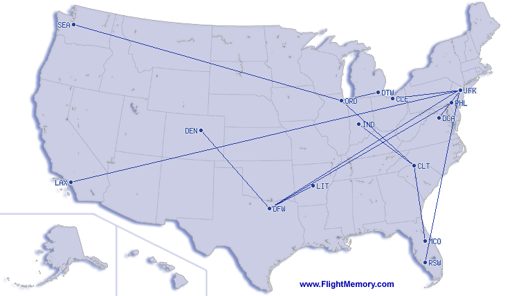 | Nejkratší let: | 213 mi, 0:53 h, Washington (Ronald Reagan National) - New York (John F. Kennedy), 12-16-2025 |