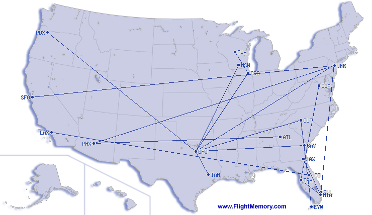 | 최단거리비행 : | 206 mi, 1:19 h, Tampa (International) - Miami (International), 02-25-2026 |