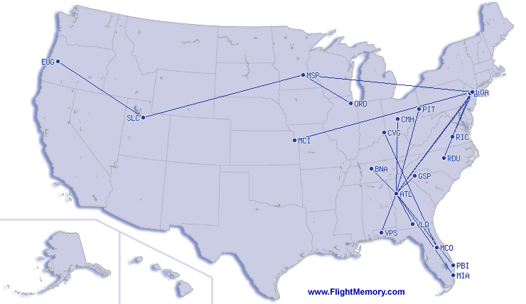 | Najkraci let: | 153 mi, 0:53 h, Atlanta (Hartsfield - Jackson Int.) - Greer (Greenville Spartanburg Int.), 03-10-2026 |