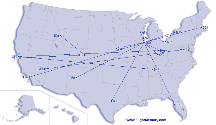 | Kortste vlucht: | 67 mi, 1:00 h, Chicago (O'Hare) - Milwaukee (General Mitchell), 04-24-2026 |
