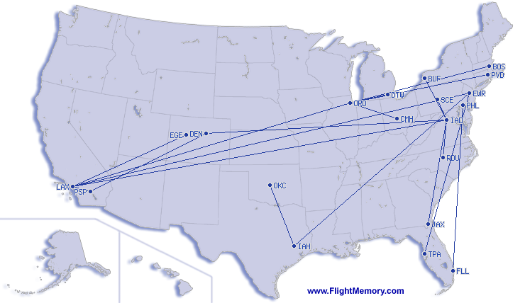 | Korteste flygning: | 109 mi, 1:09 h, Los Angeles (International) - Palm Springs (International), 03-23-2026 |