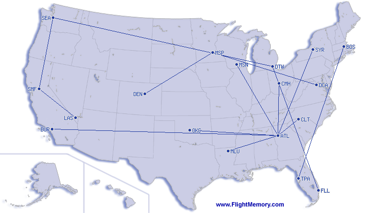 | Kortast flygsträcka: | 227 mi, 0:54 h, Atlanta (Hartsfield - Jackson Int.) - Charlotte (Charlotte/Douglas International), 11-27-2025 |