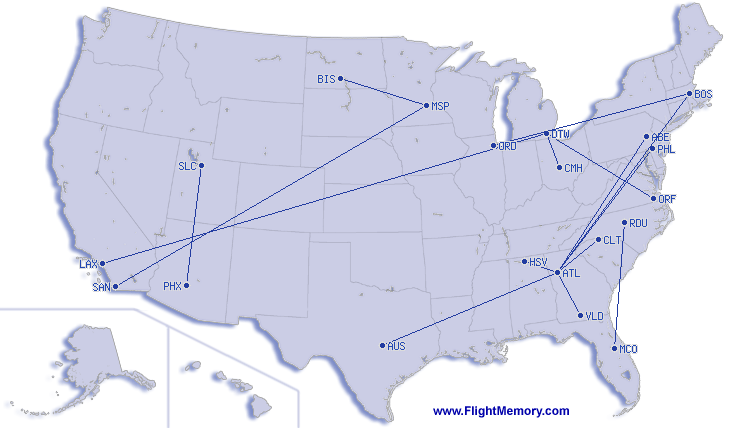 | najkrajši let: | 151 mi, 0:33 h, Atlanta (Hartsfield - Jackson Int.) - Huntsville (Carl T. Jones Field), 12-16-2025 |