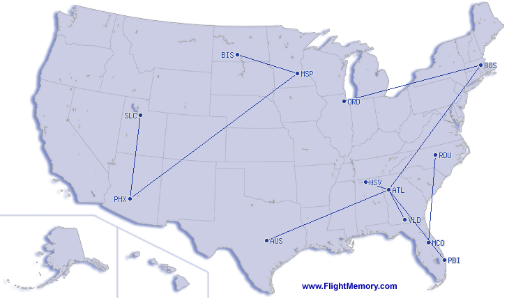 | Найкоротший політ: | 151 mi, 0:33 h, Atlanta (Hartsfield - Jackson Int.) - Huntsville (Carl T. Jones Field), 12-16-2025 |