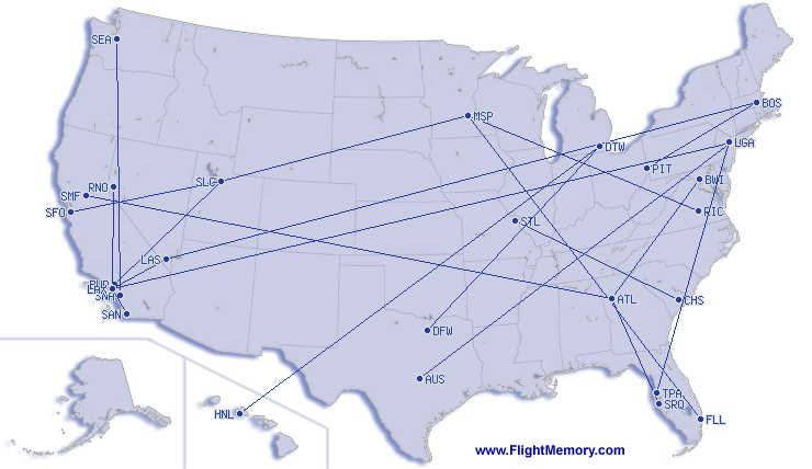 | Найкоротший політ: | 109 mi, 1:12 h, San Diego (Lindbergh Field) - Los Angeles (International), 04-07-2026 |