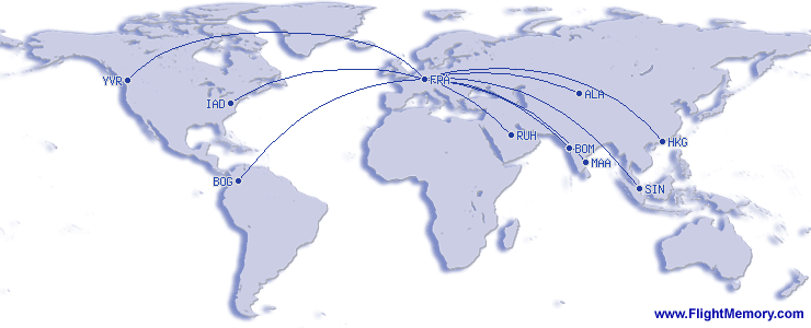 | Najdlhší let (vzdialenosť): | 6,395 mi, 13:00 h, Singapore (Changi) - Frankfurt (Rhein-Main), 04-05-2026 |