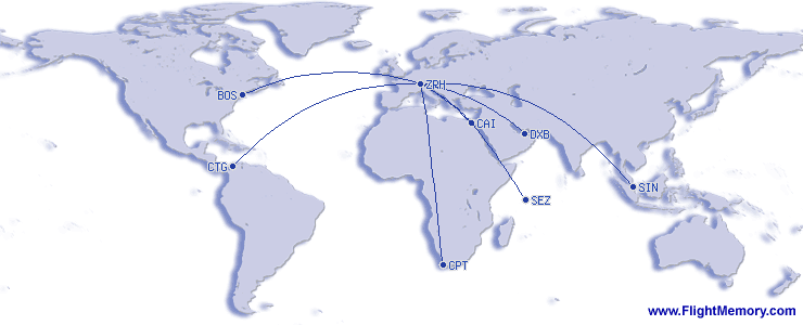 | Voo mais longo (Distância): | 6,409 mi, 13:10 h, Singapur (Changi) - Zürich (Kloten), 02-08-2026 |