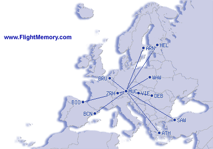| Najkratší let: | 162 mi, 0:47 h, Zürich (Kloten) - München (Franz Josef Strauß), 03-14-2026 |