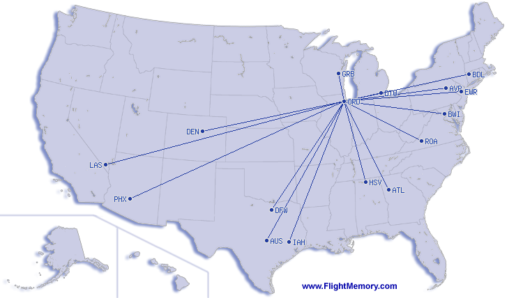 | Najkratší let: | 174 mi, 0:00 h, Chicago (O'Hare) - Green Bay (Austin Straubel International), 04-09-2026 |